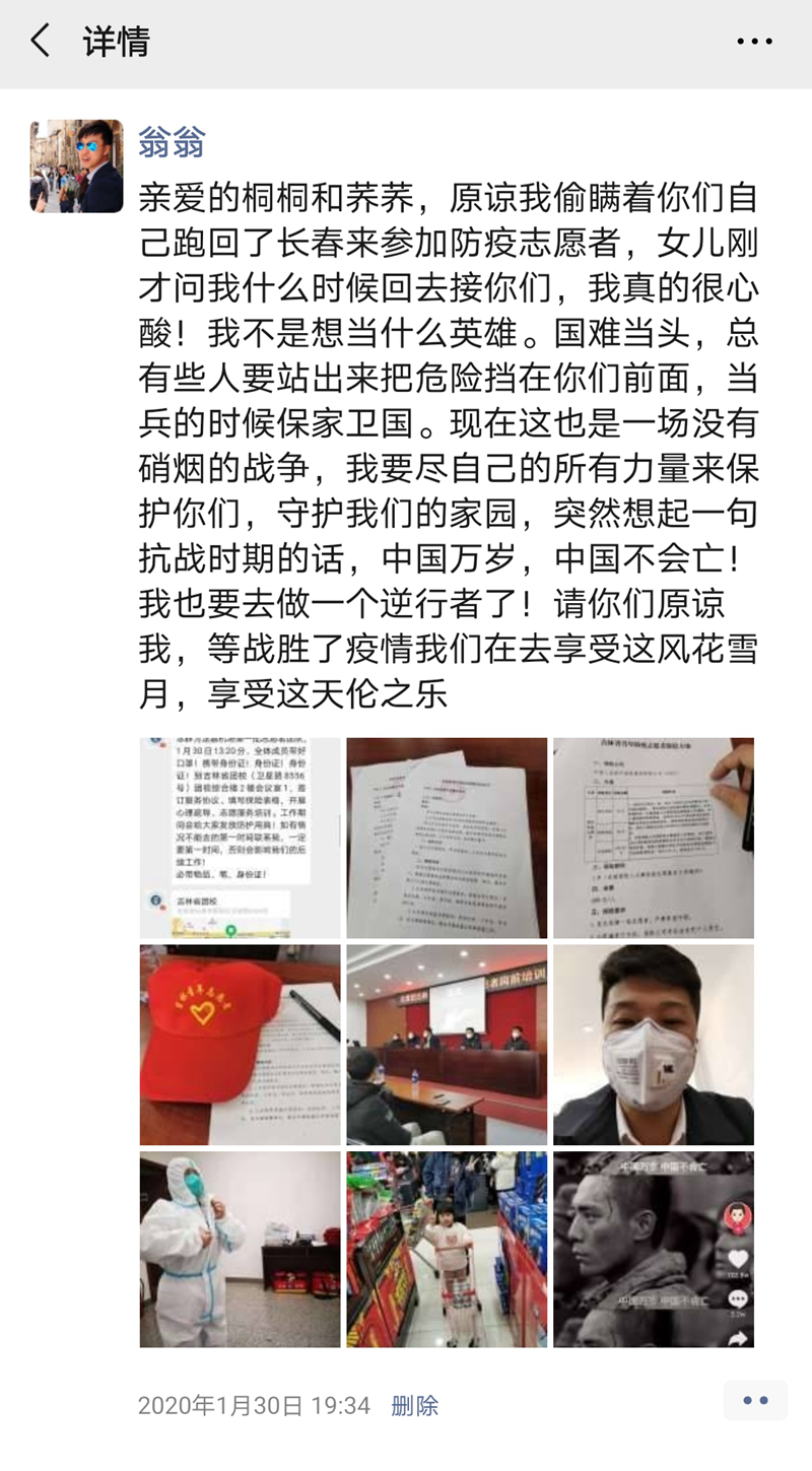 在春节阖家团圆的日子里,一场来势汹汹的新冠肺炎疫情牵动着全国人民的心。翁亮也和周围人一样,一面避免感染尽量减少外出活动,一面密切关注着抗击疫情的最新消息。但作为一名共产党员和退伍军人,他心中时刻铭记着入党的誓言和军人的使命。若有战召必回,内心强烈的责任感促使他积极寻找能够为抗击疫情作出贡献的机会。1月27日,当他在网上看到团省委招募青年防疫志愿者的通告时,再也按捺不住内心的向往,立刻决定报名参加。为不让家人担心,翁亮瞒着妻子,借口回单位值班,第二天一早就从老家白城赶回了长春,时刻准备冲上一线。