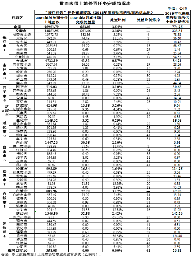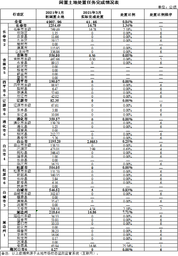 2021年,全省共有闲置土地4907.96公顷。一季度,全省实际处置闲置土地41.46公顷,处置率为0.84%。处置率达到15%的是:安图县(25.56%)。榆树市、蛟河市、桦甸市、舒兰市、磐石市、辉南县、长白县、扶余市、镇赉县、洮南市、汪清县等11个县市无闲置土地。(见附件4)