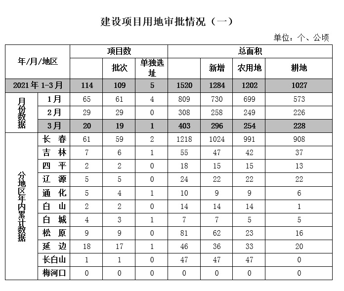 一季度,全省共批准建设项目用地1520公顷,其中新增1284公顷,农用地1202公顷,耕地1027公顷。城、镇、村建设用地1488公顷,包含工矿用地225公顷、商住用地588公顷、基础设施用地200公顷、其他建设项目用地475公顷;单独选址项目建设用地32公顷,包含交通用地12公顷、水利用地3公顷、矿山用地3公顷、其他项目建设用地14公顷。(见附件1、2)